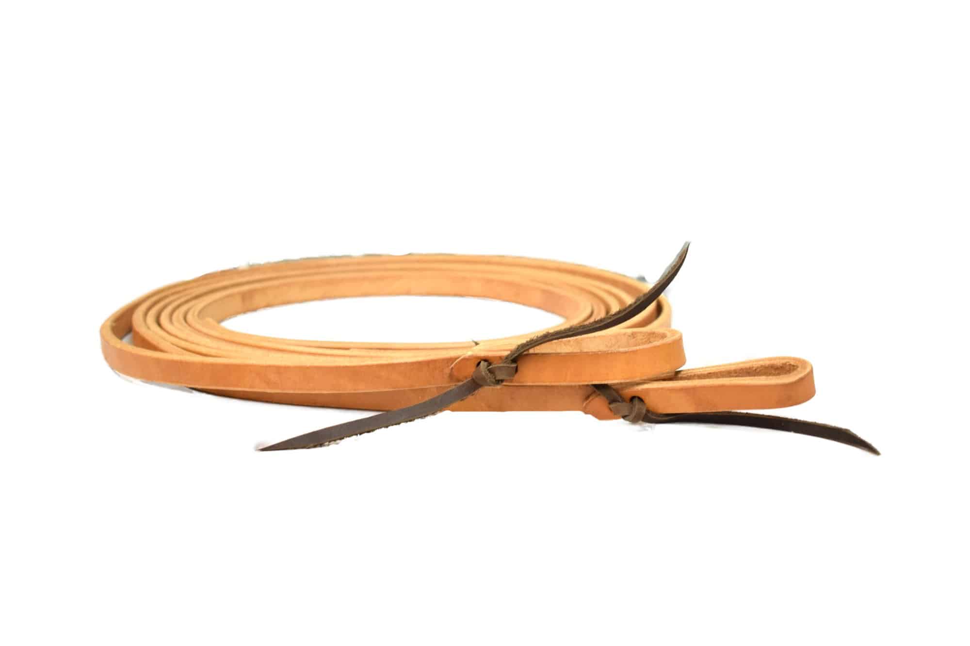 A pair of 8′ weighted 5/8″ reins, made from 13-15 ounce russet harness.