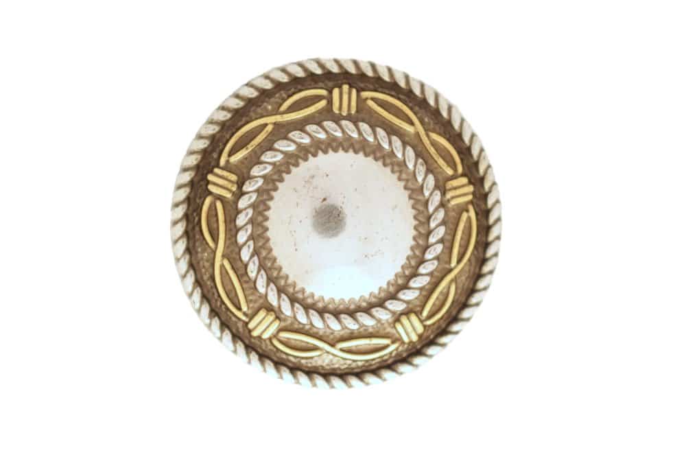 Round concho with yellow barbed-wire design with silver rope borders. Screw back attachment. Made of nickel.