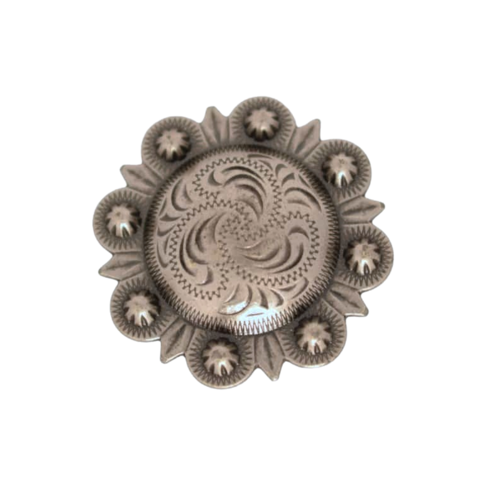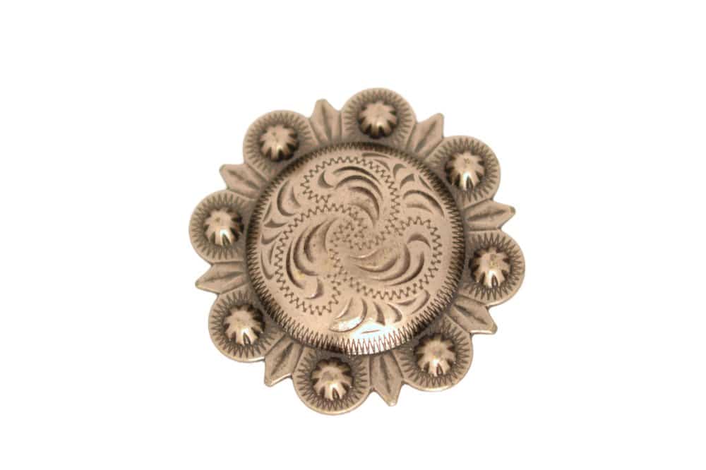 An antique silver concho with engraved designs and berries. Available in three different sizes: 1″, 1 1/4″ & 1 1/2″.