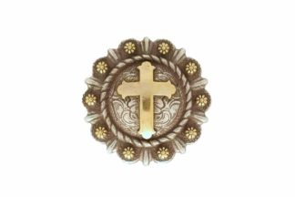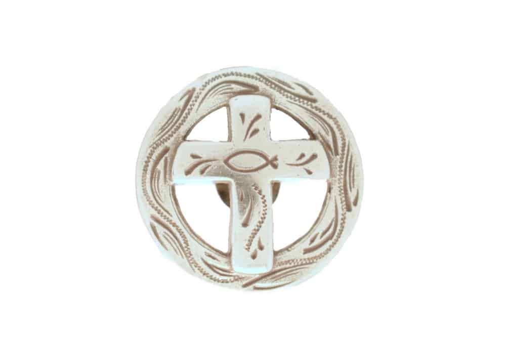 Round, silver concho with antique cross design. 1 1/4″ diameter. Screw back attachment. Made of nickel