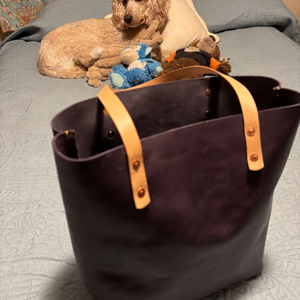 This was my second tote and the handle is veg tan attached with copper rivets, yellow Tiger thread.
