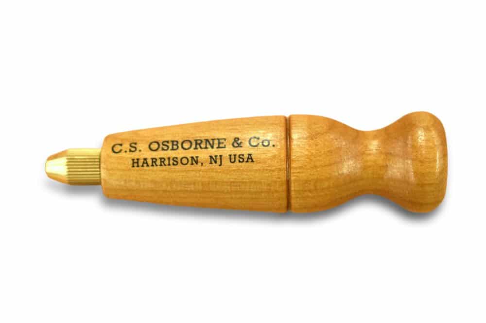 The 141 awl haft from Osborne has a lacquer finish and a brass chuck designed to hold awls or wider needles. Knurling on chuck makes it easy to tighten manually. Note, to fit Osborne harness and stitching awls, you need the 145 awl haft instead.