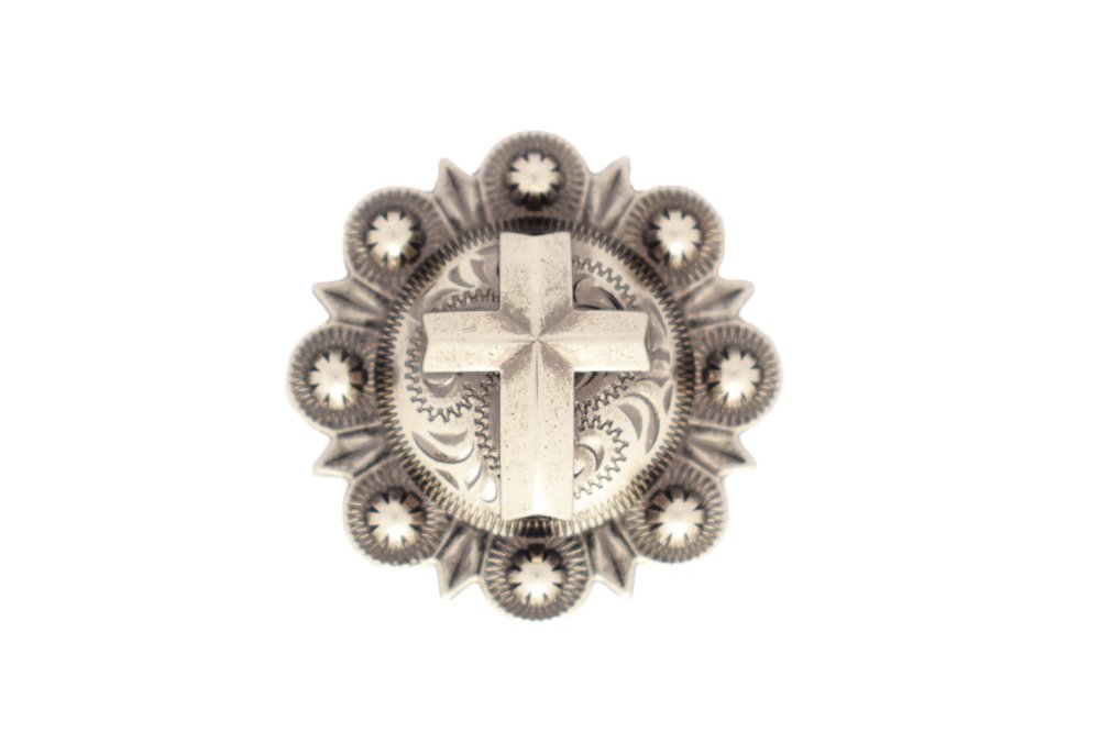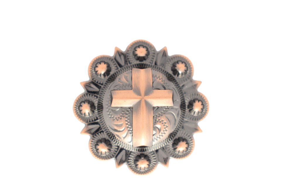 Round concho with a cross design and berry border. Comes in three finishes: gold, antique, and copper. Screw back attachment. Made of nickel.