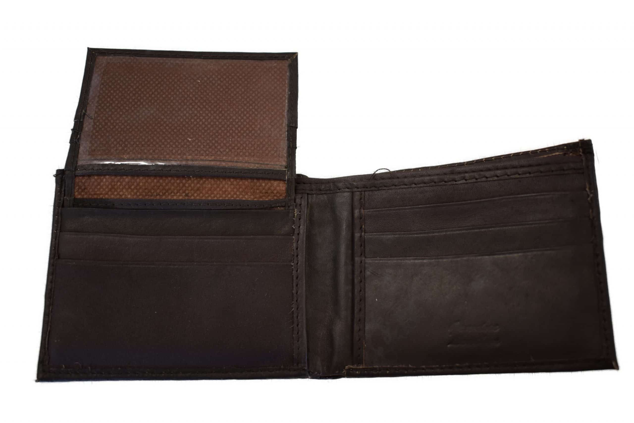 A bi-fold leather wallet in black, crafted with genuine cowhide leather. Two large pockets are provided for cash and other similar items, as well as several slots for credit cards. Additionally, there is a removable ID holder. Dimensions measure 4.5? x 3.5? x 1?.
