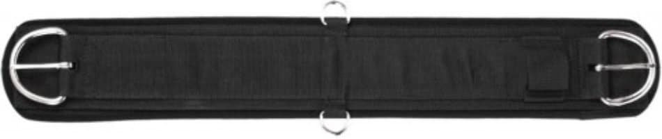 A black shooter cinch with nickel plated buckles. Straight, black nylon cinch with removable PVC backing and nickel plated hardware. PVC moves with the horse to help prevent chaffing and soreness. The PVC back detaches from the nylon webbing for quick and easy cleaning. Featured with 3? nickel plated straight pull buckles and 1? dees. Size: 28?, 30?, 32?, 34?, 36?