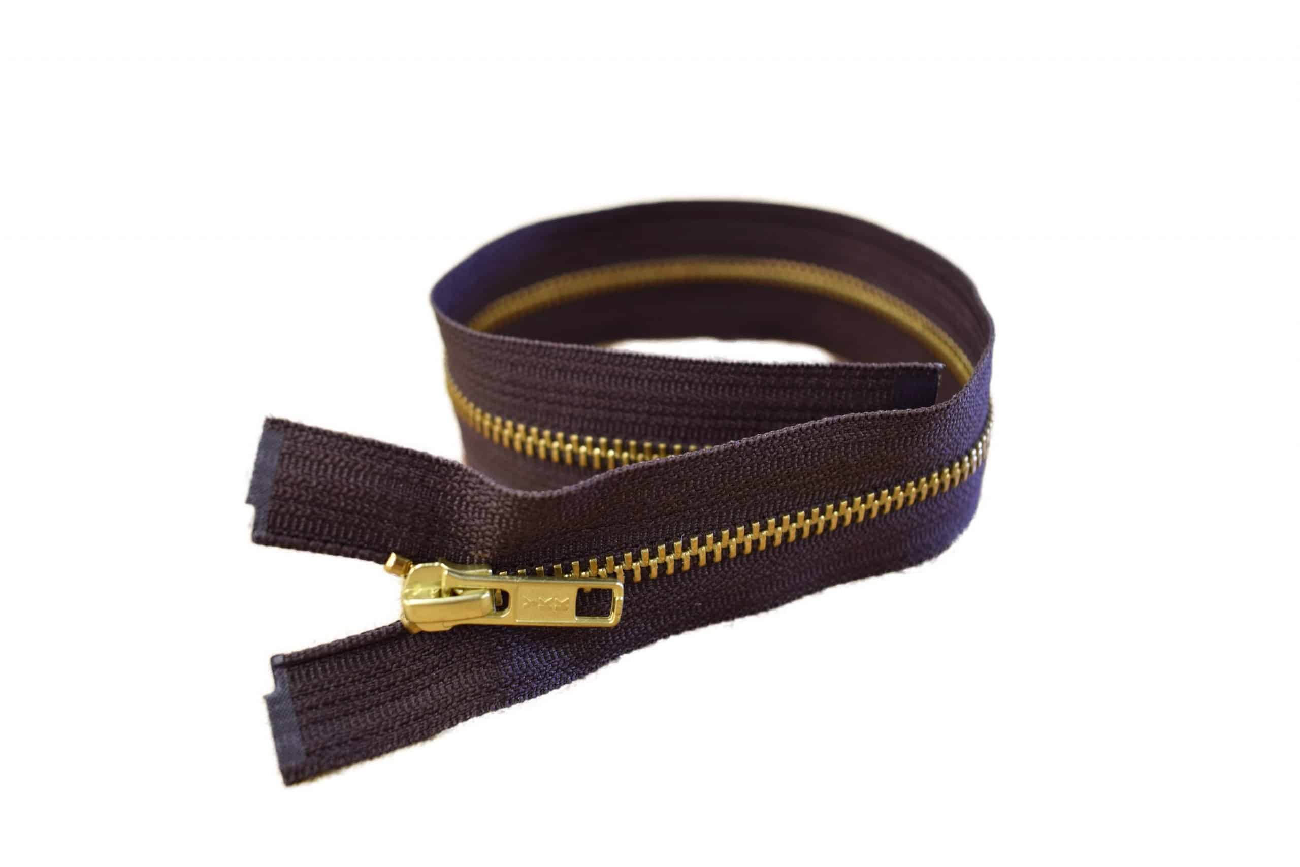 A brown tape zipper with brass teeth and parts. Open-ended and typically used for smaller items, such as light bags, purses or cases. Measures 1 3/8″ across and available in a wide range of lengths to fit your needs. The slides and stops are YKK.