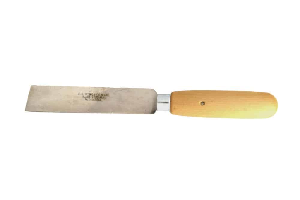 A wide, steel blade with a polished hardwood handle from C.S. Osborne. Blade length measures approximately 5″, and the blade width measures 1 1/8″.