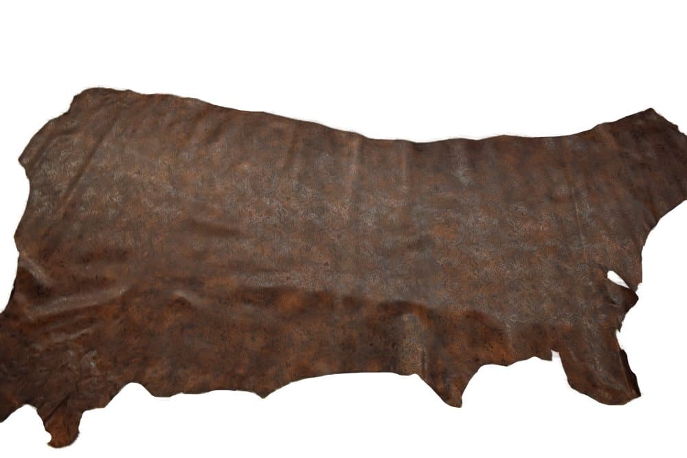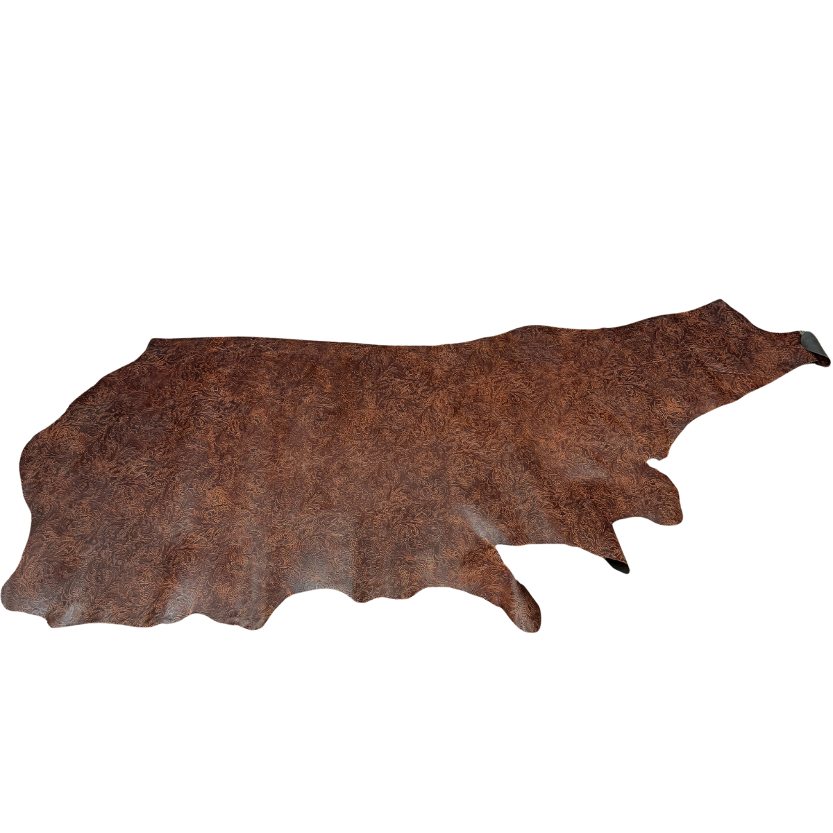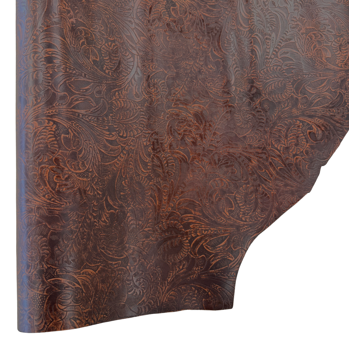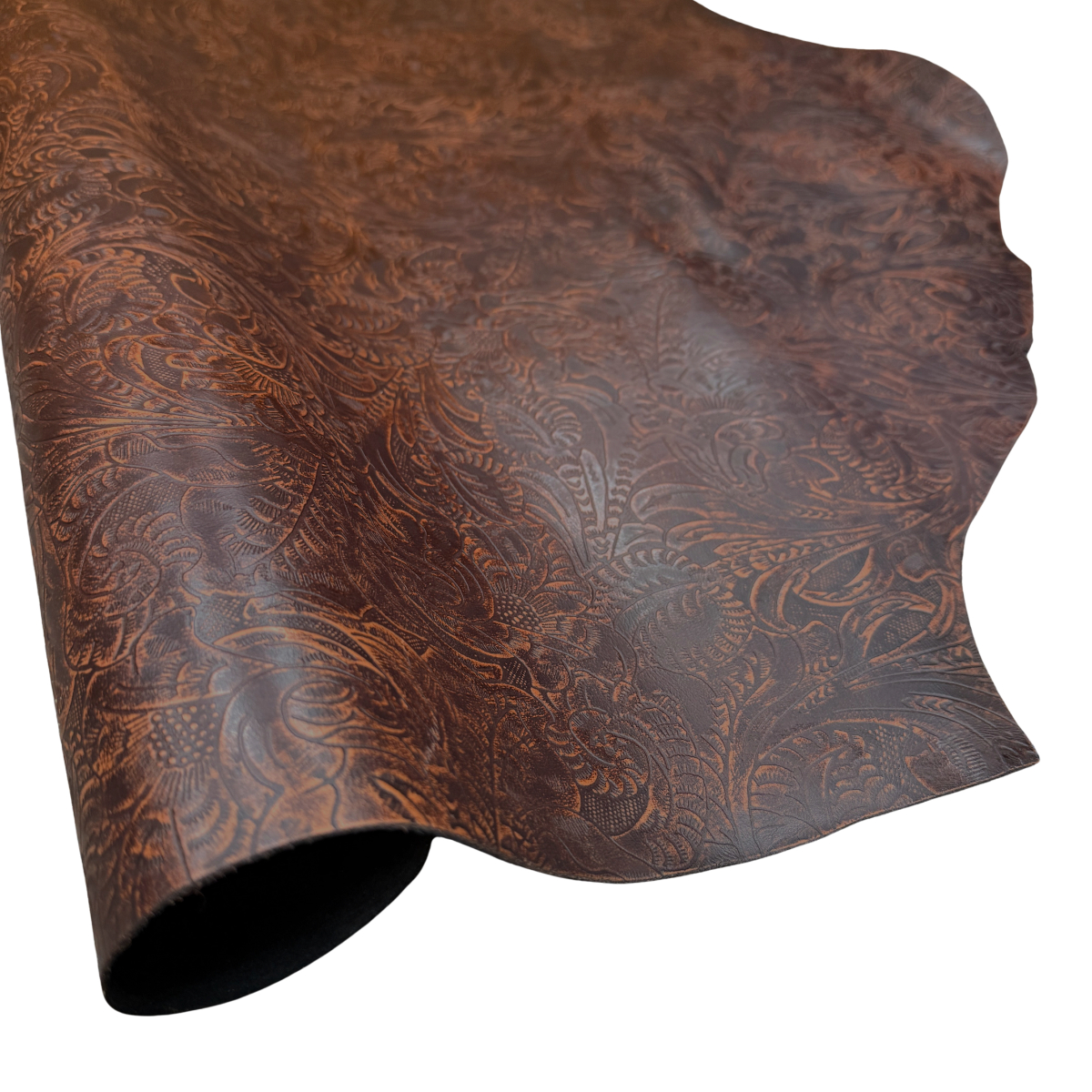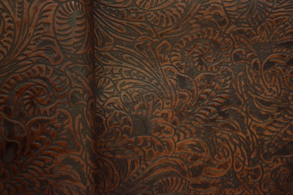Western Floral embossed leather in a dark cognac with black undertones. At 3-4 ounces (1/16″) and mild to medium stiffness, this leather may be used for making bags, wallets, earrings and more. Cut pieces are available too!