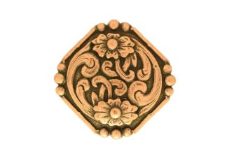 A chicago screw in copper with a rope edge and floral design. Measures 1/2″ in diameter.
