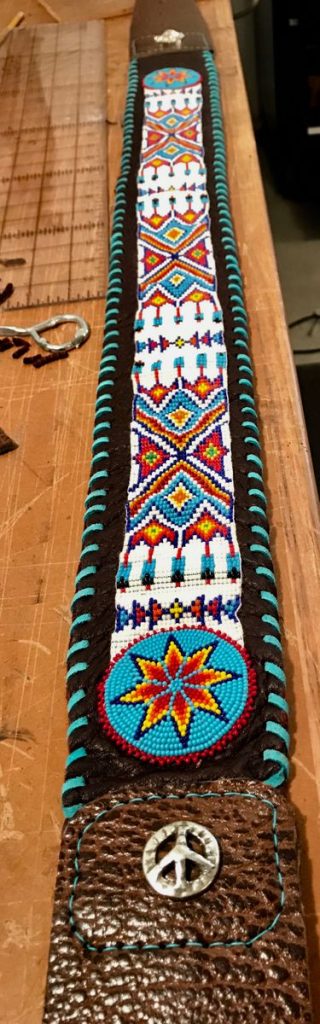 Beaded guitar strap on the soft deer hide.