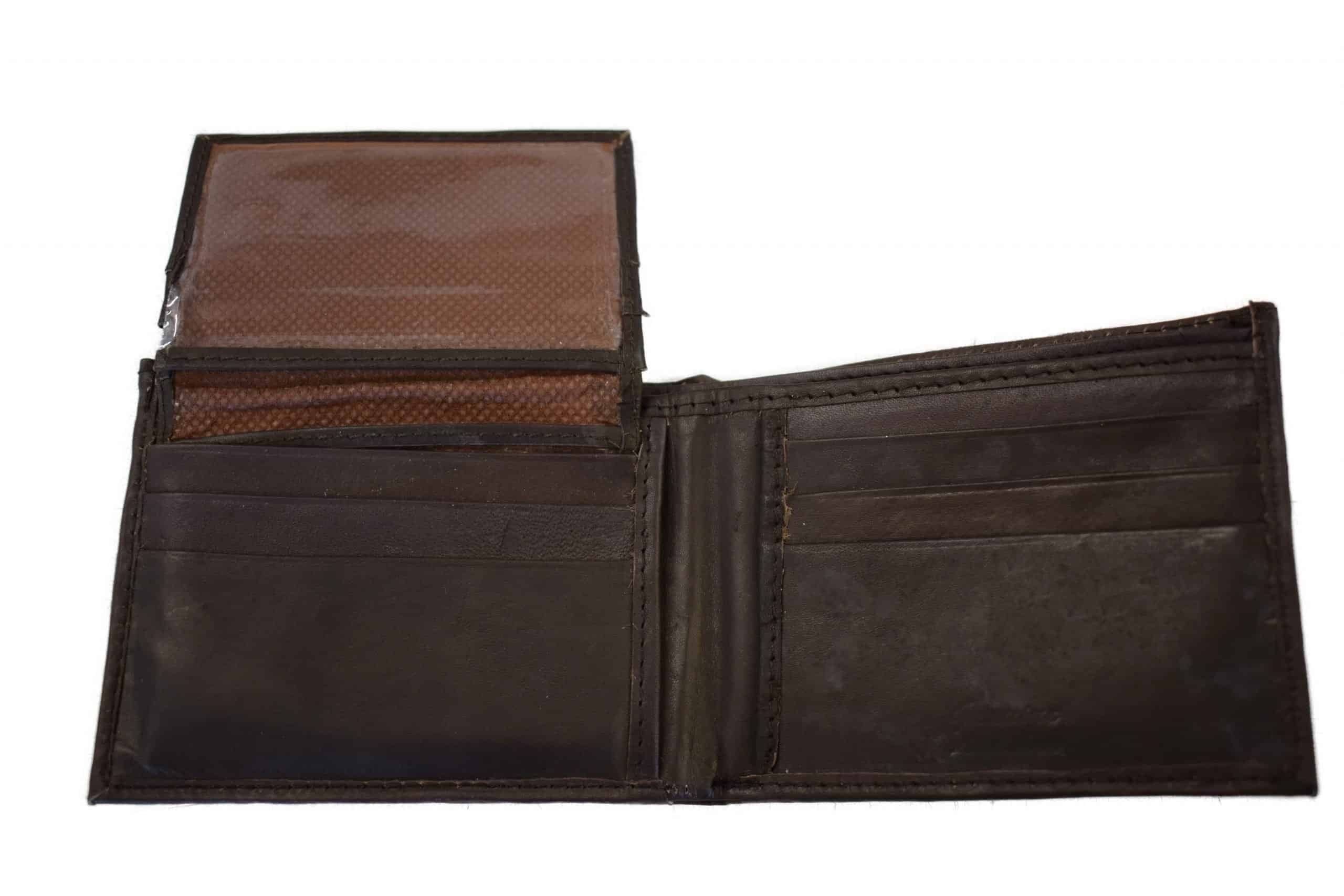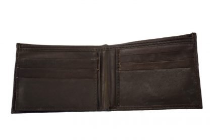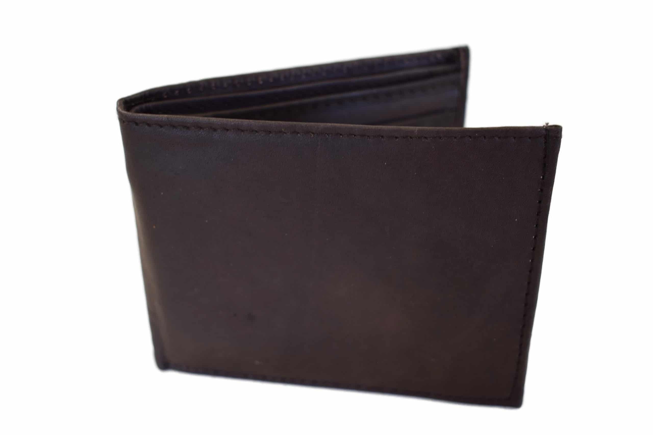 A bi-fold leather wallet in dark brown, crafted with genuine cowhide leather. Two large pockets are provided for cash and other similar items, as well as several slots for credit cards. Additionally, there is a removable ID holder. Dimensions measure 4.5? x 3.5? x 1?.