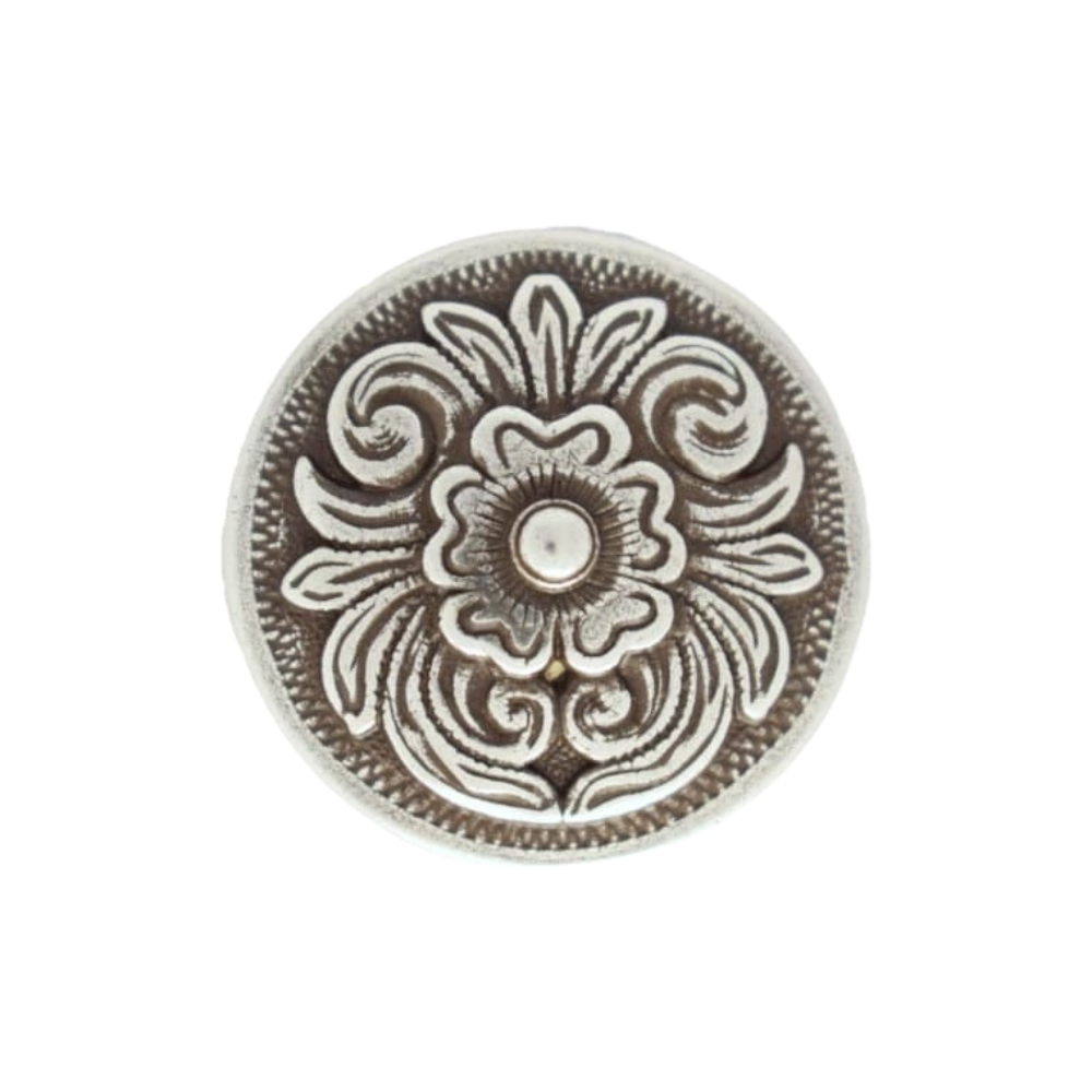 Round, silver concho with flower engraving. Screw back attachment. Made of Nickel.