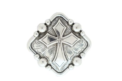 Diamond shaped concho with cross design. 1 1/2″ wide at longest. Screw back attachment. Made of nickel.