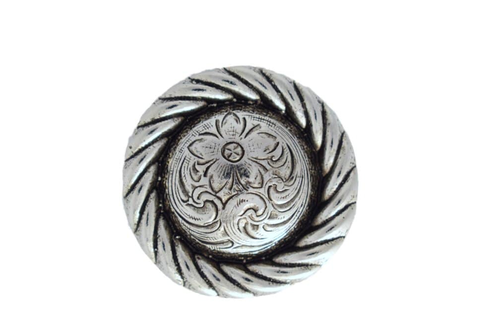 Round, silver concho with domed shape, engraved pattern, and large rope border. 1 1/2″ wide at diameter. Screw back attachment. Made of nickel.