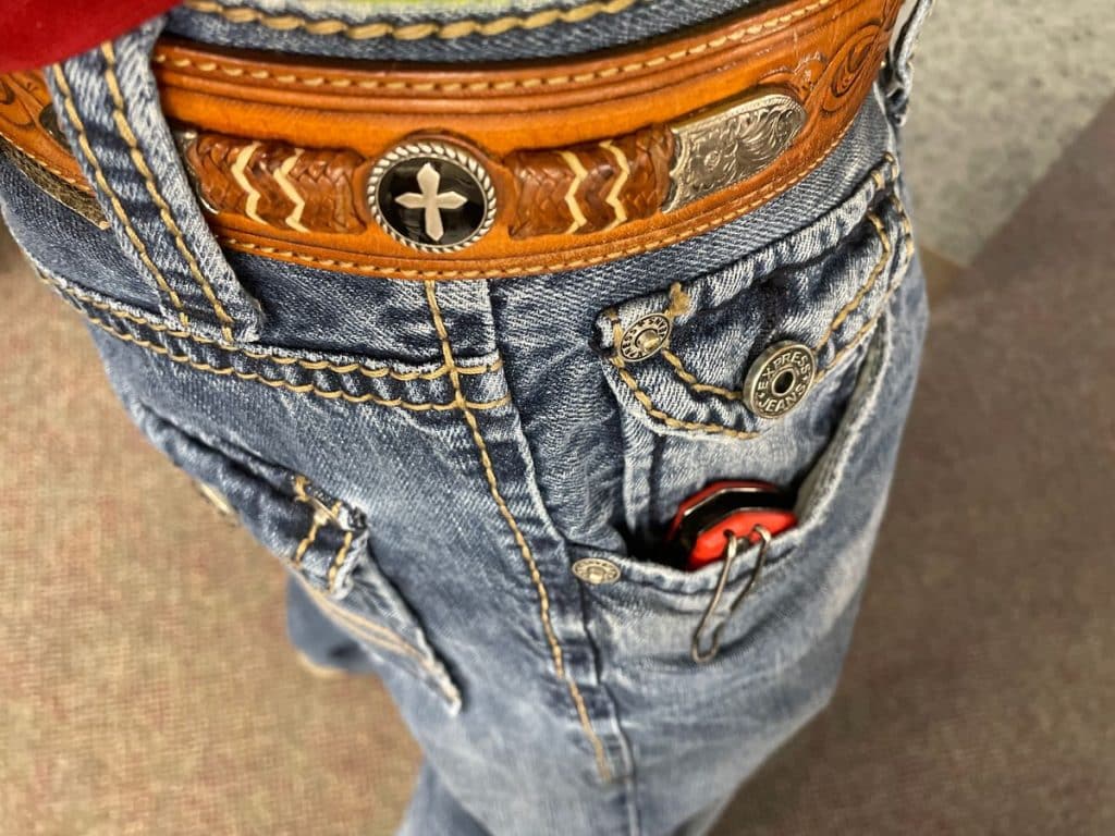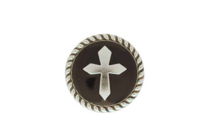 Round, silver concho with silver cross and rope border on black background. Screw back attachment. Made of nickel.