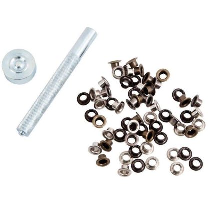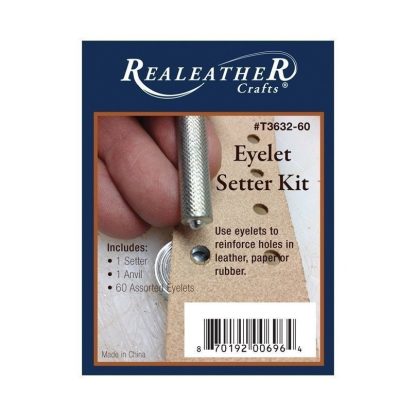 A practical kit for setting eyelets. Comes with a solid steel eyelet setter, anvil and 60 assorted 3/16″ eyelets.