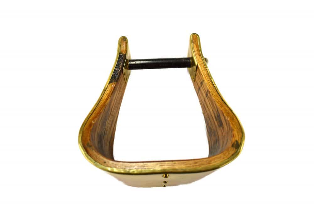 Hand made brass stirrups from Fandek Saddles. These bell stirrups have a solid oak base covered in solid brass, polished to a shimmering finish. Available in various tread sizes from 3? to 5?. The base, from side to side, measures 5 1/4?.