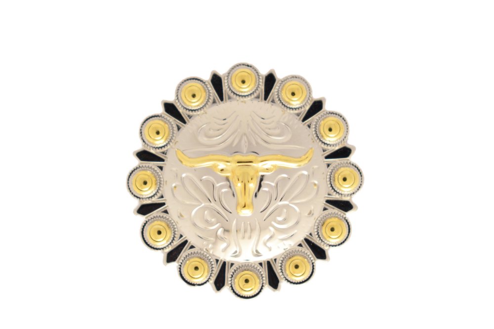 Engraved concho with a gold colored steer design and gold colored berry border, on a silver colored background. Screw back attachment. Made of nickel.