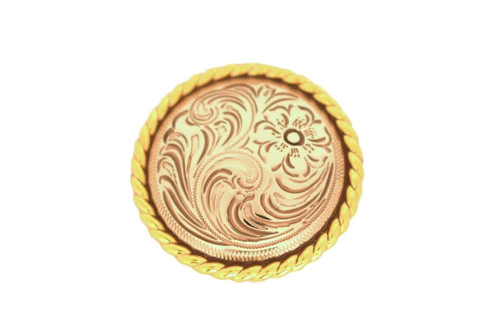 A beautifully designed, engraved old silver concho with a gold rope edge. Available in four sizes: 1″, 1 1/4″, 1 1/2″ & 2 3/8″.