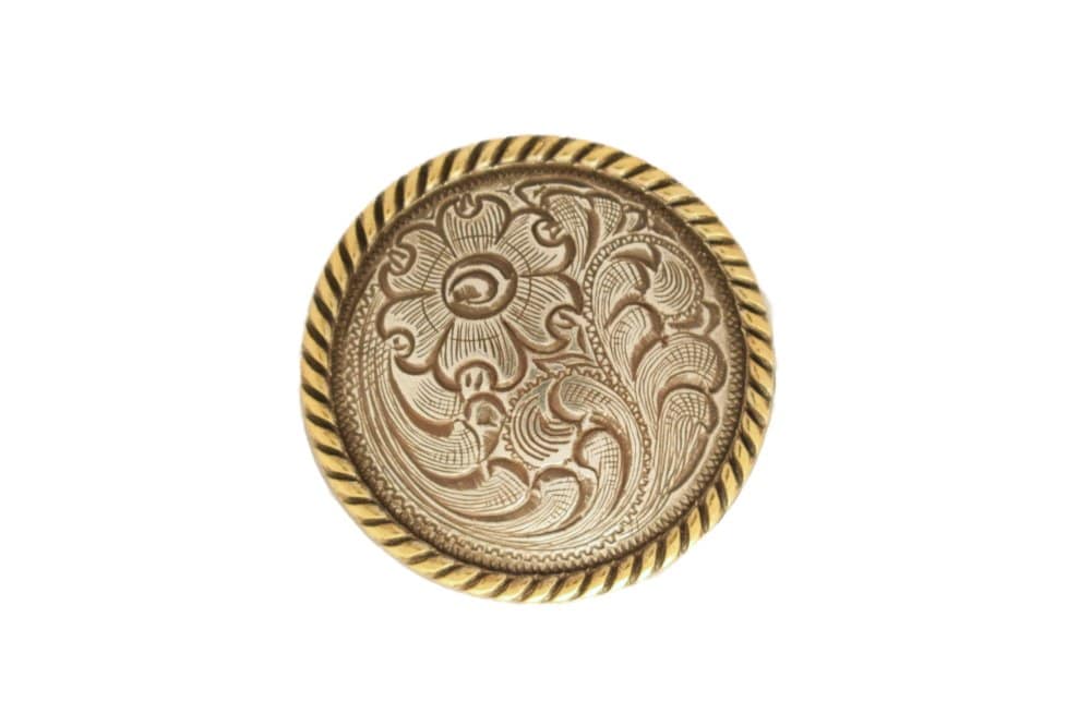 Round concho with a flower engraved pattern on antique finished nickel. Yellow rope pattern border. Screw back attachment. Made of nickel