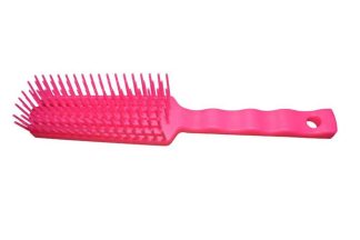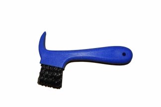 Durable plastic features stiff bristles and a steel pick for cleaning. Finger grips make this easy to hold and use – even for children. Designed with fun horse head shape. Available in assorted colors.