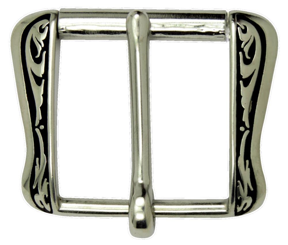 Jeremiah Watt flank buckle. SOLD IN PAIRS. The strongest flank buckle on the market with a heavy stainless roller and hefty tongue. Floral art with black patina. Size 1 3/4″ only.