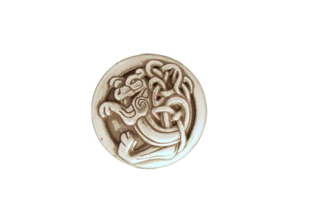 Round, silver colored concho with a dragon design. 1″ wide diameter. Screw back attachment. Made of nickel.