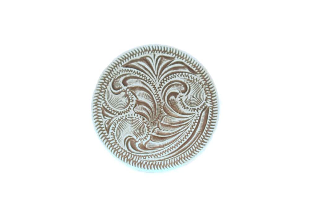 Round, engraved silver concho. Screw back attachment. Made of nickel