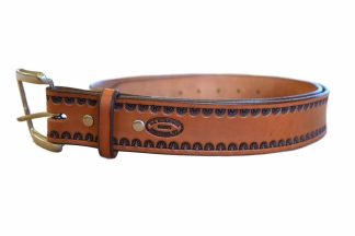A bordered leather belt with a 5 seed border stamped design, crafted with Hermann Oak leather. Made by Black Sheep Leather in Bozeman, MT. Has a width of 1 1/2″.