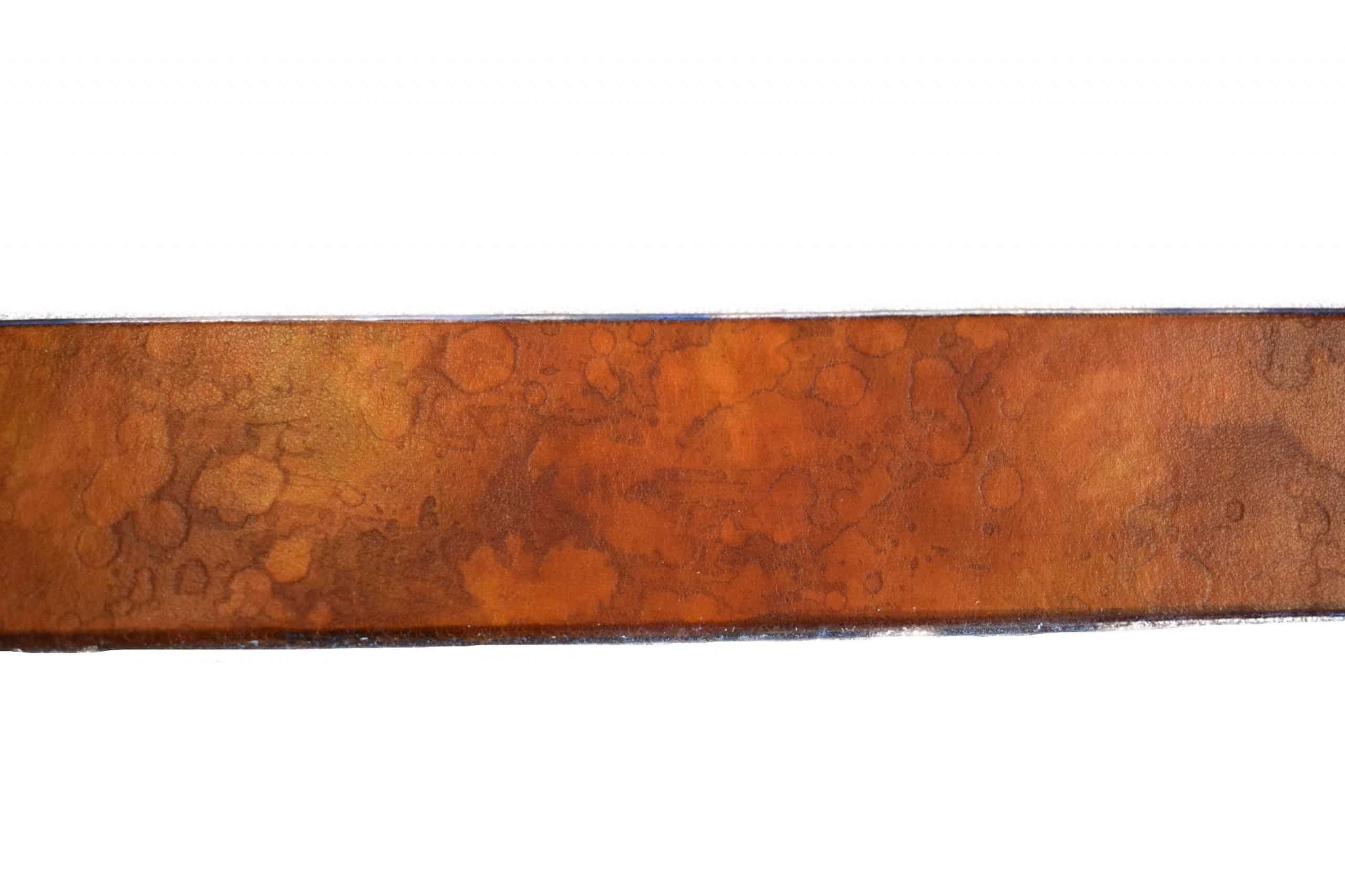 A leather belt made by Black Sheep Leather in Bozeman, MT. This belt has a fall color, stained design that creates a multi-color effect. Made out of premium Hermann Oak leather. Width measures 1 1/2″ across.