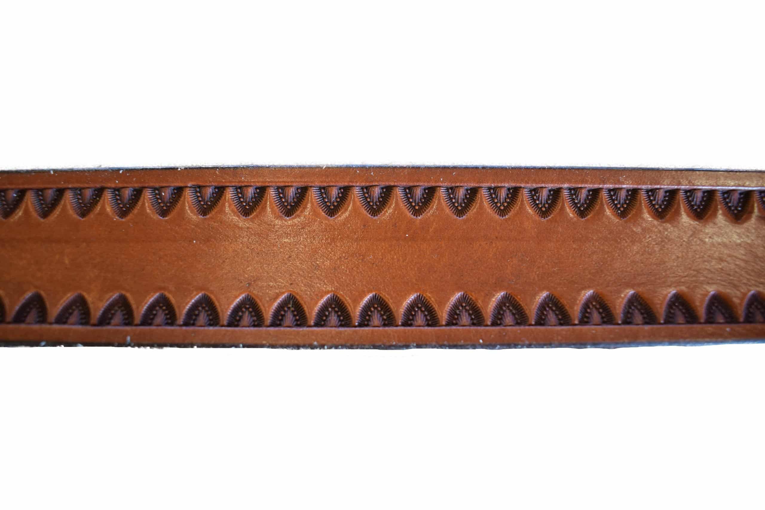 A belt made by Black Sheep Leather in Bozeman, MT. A simple design with a wishbone style border. Made out of premium Hermann Oak leather. Belt width measures 1 1/2″.