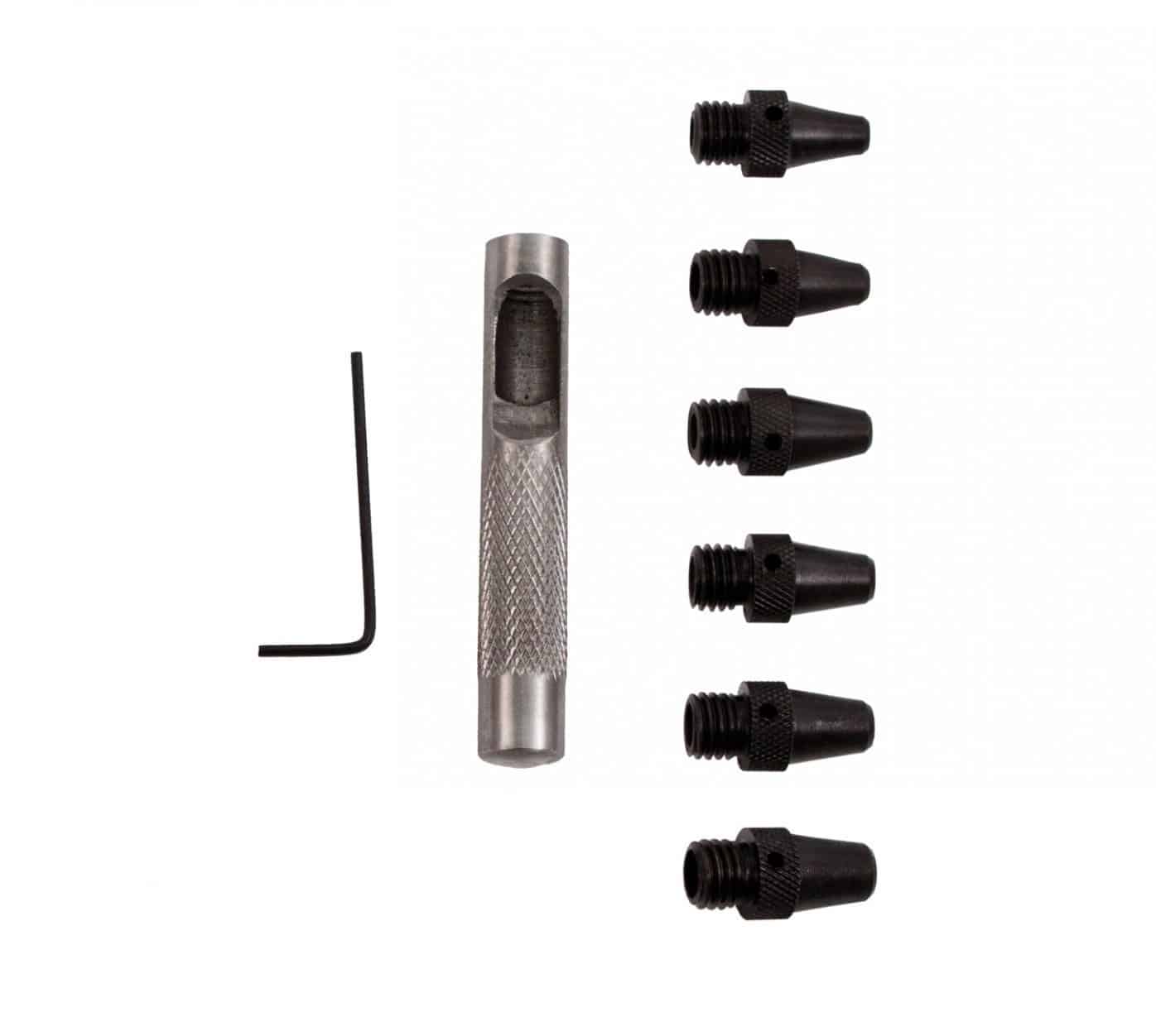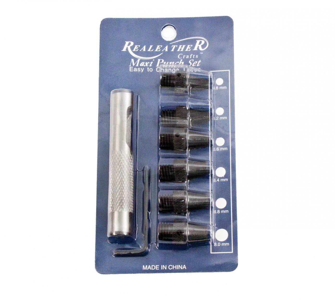 A set of drive punches from Silver Creek offering some of the most common, larger sizes of interchangeable tubes. Quality made with solid steel handles, designed to last a lifetime. The maxi punch set sizes are ideal for grommets, eyelets and larger holes ranging from 3/16″ up to 5/16″.