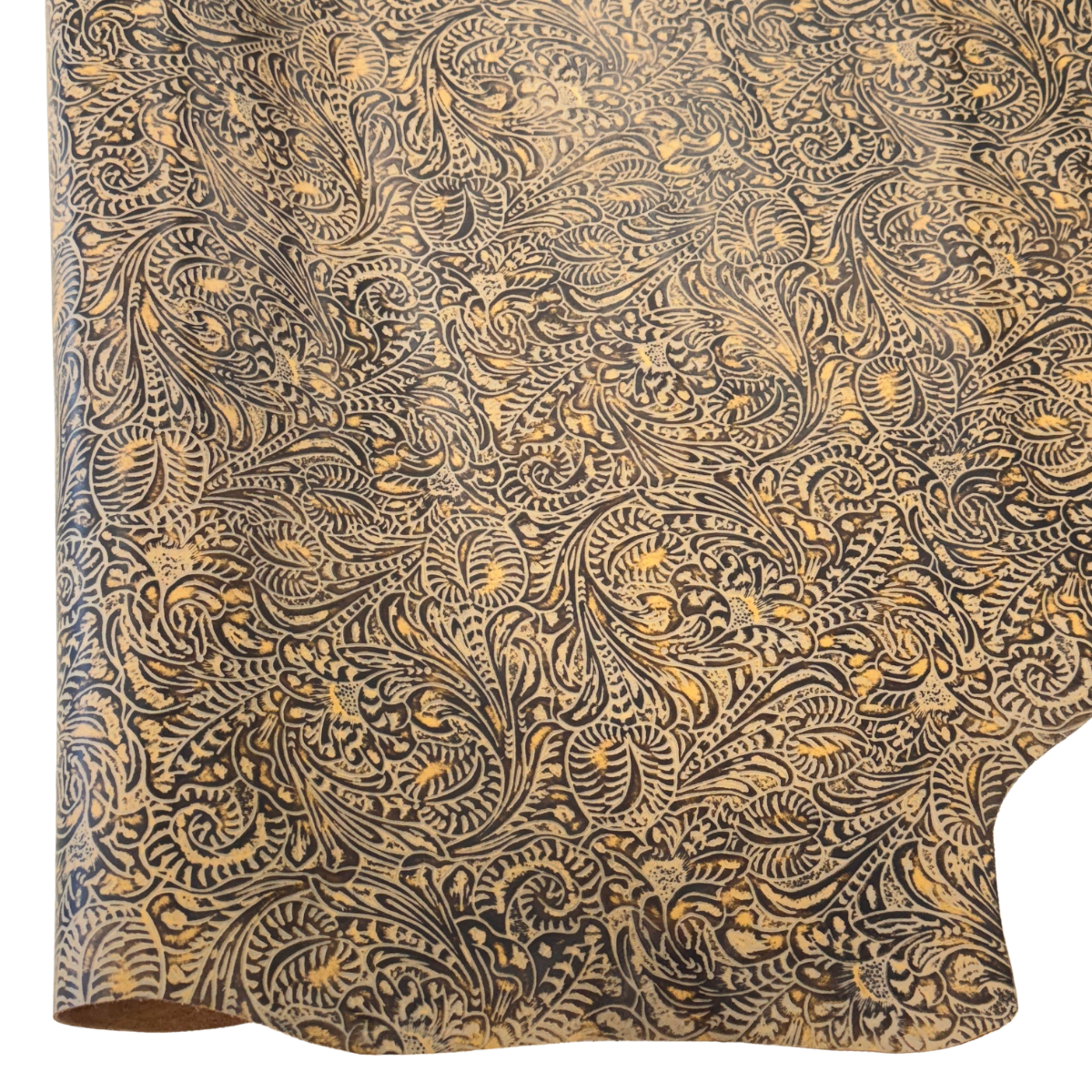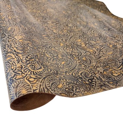Western Floral embossed leather in a natural color. At 3-4 ounces (1/16″) and mild to medium stiffness, this leather may be used for making bags, wallets, earrings and more. Some of the undertones in the tan variation run from light tan to dark brown, occupying an earth tone spectrum. Cut pieces are available too!