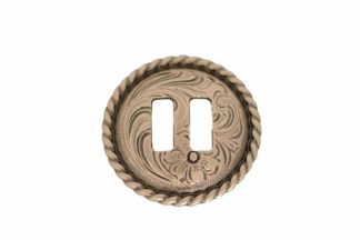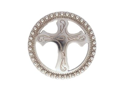 Round, silver colored concho with an open cross design. Screw back attachment. Made of nickel