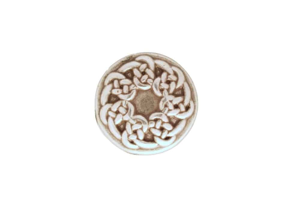 Round, silver colored concho with braid/knot pattern design. 1″ diameter. Screw-back attachment. Made of nickel.