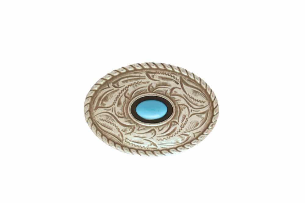 Oval shaped, silver engraved concho with turquoise center. 1 1/2″ wide. Screw back attachment. Made of nickel and turquoise.