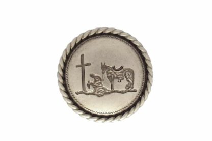 Round, silver colored concho with an engraved design of a praying cowboy. 1 1/4″ diameter. Screw back attachment. Made of nickel