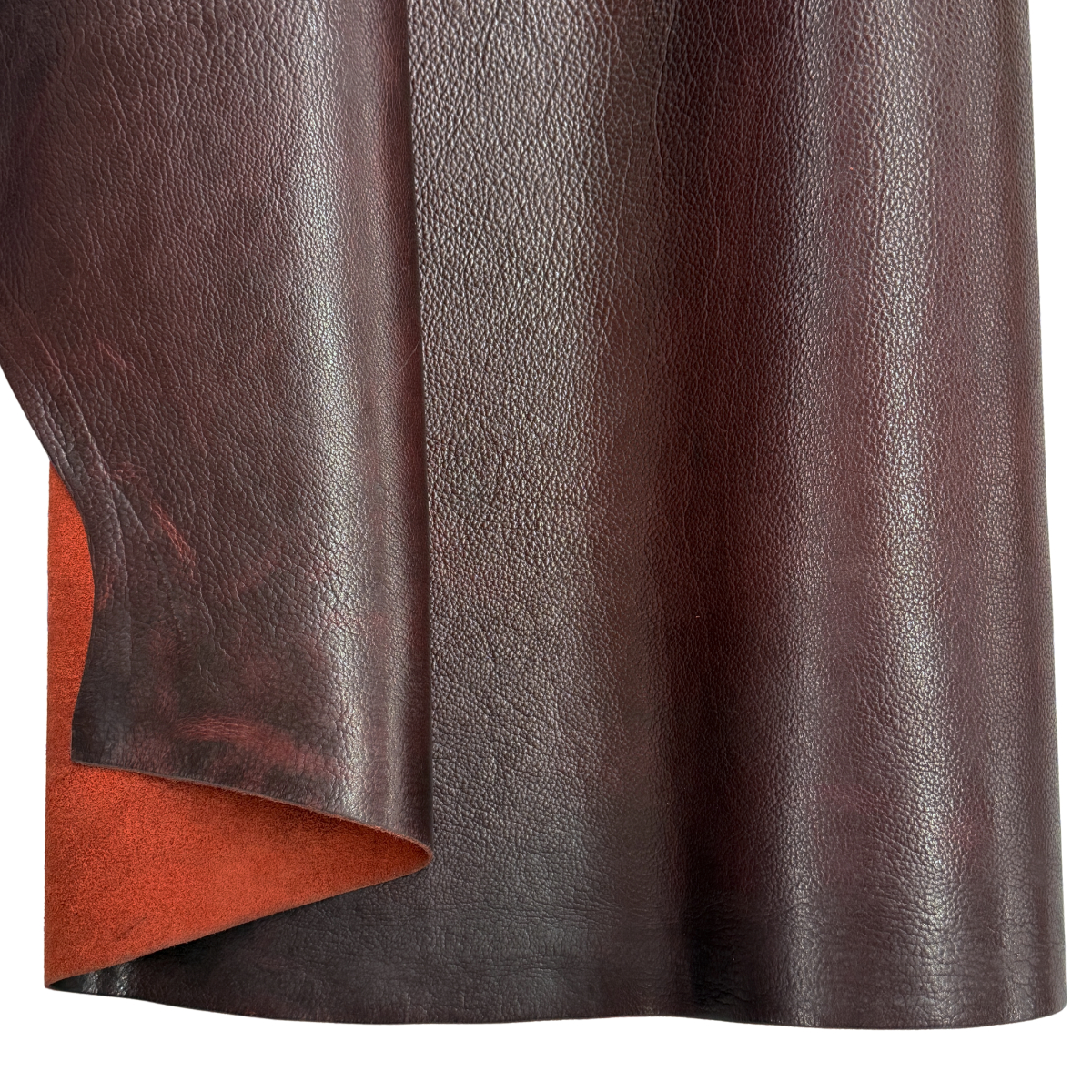 Shrunk bison leather in red.
