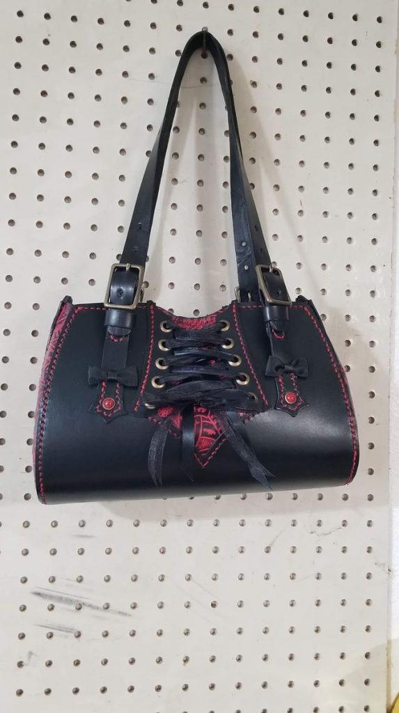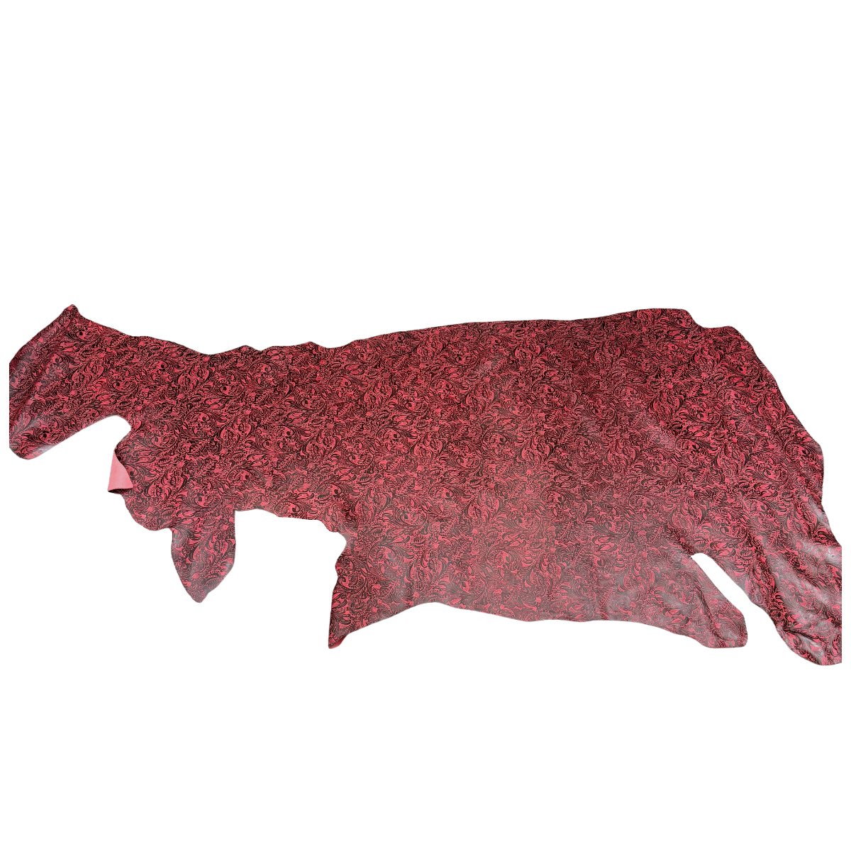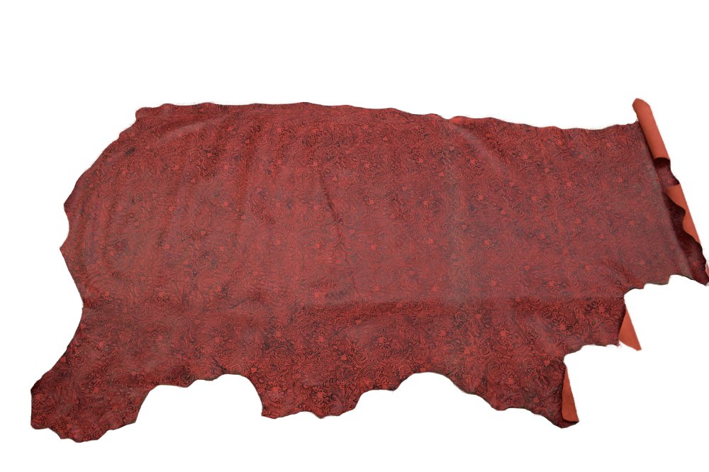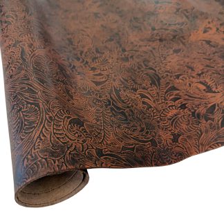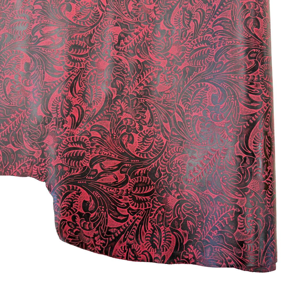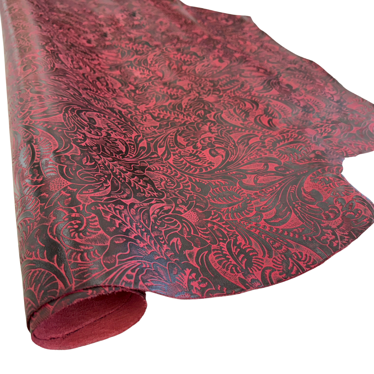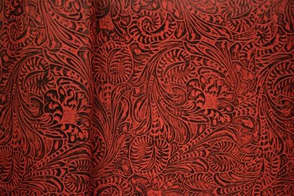 Western Floral embossed leather in a red color with black undertones. At 3-4 ounces (1/16″) and mild to medium stiffness, this leather may be used for making bags, wallets, earrings and more. Cut pieces are available too!