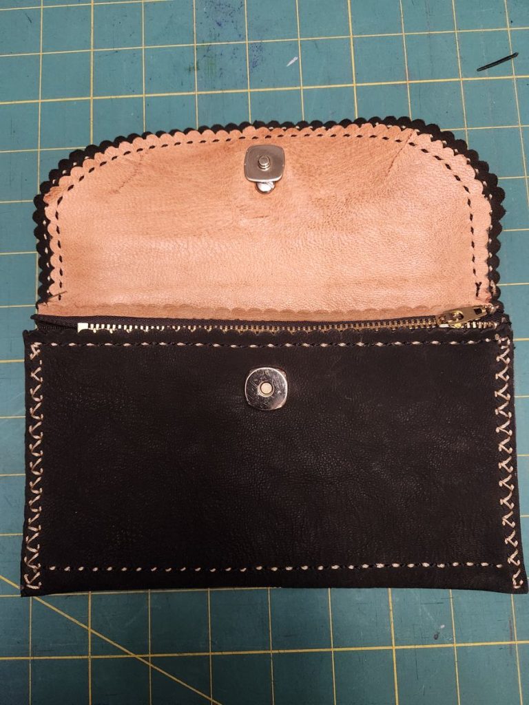 I like this glue because it does not have an odor to it. I make small items with lightweight leather and it works very well. I used a brush to apply it. The picture is goat skin and deer leather purse using the glue. It does not gum up when you stitch through it either.