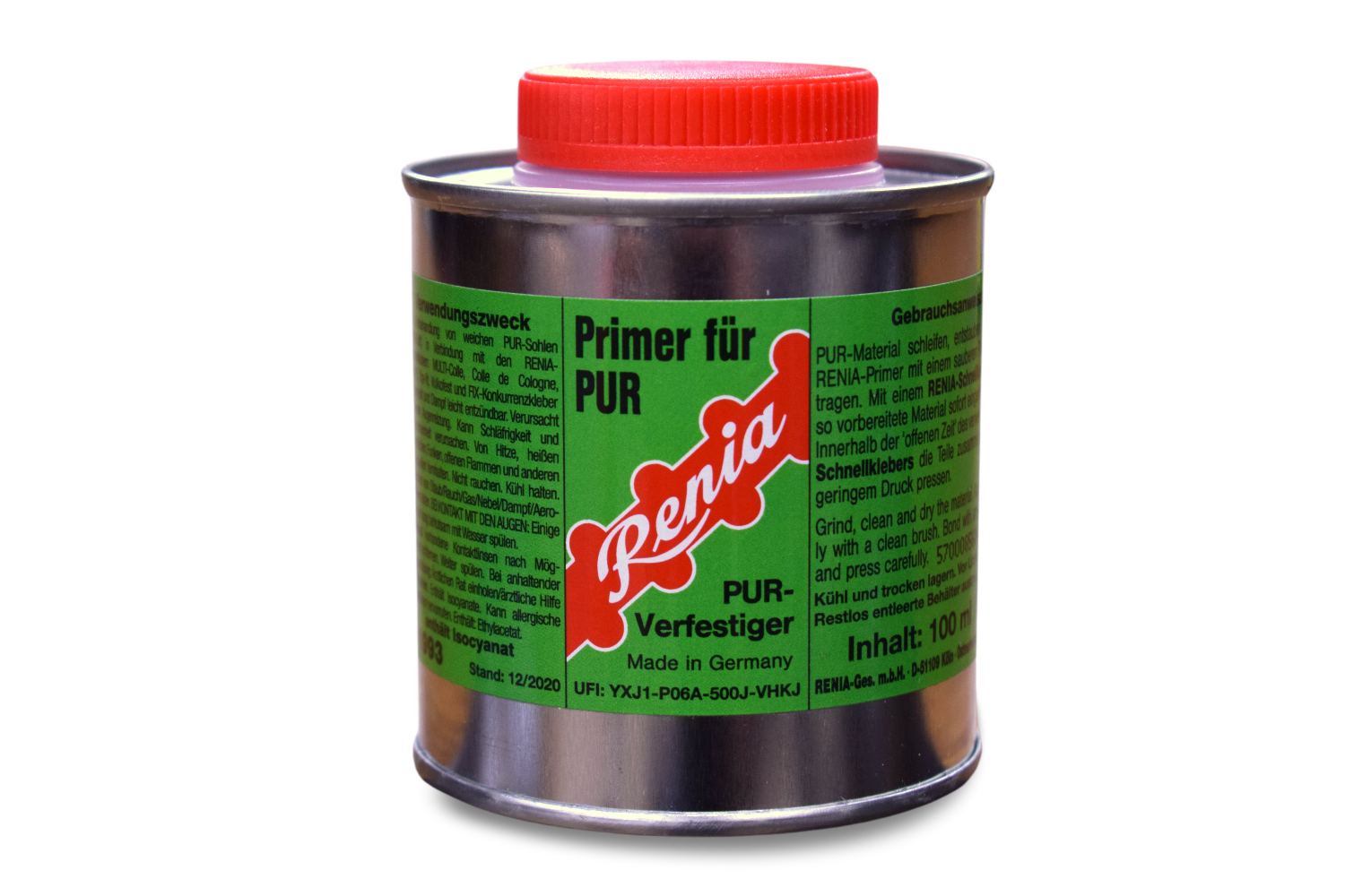 Renia PUR Primer provides a solution for bonding polyurethane materials. Pre-coat the surface of the material with primer, and then immediately apply Colle de Cologne, or other Renia solvent cements, to bond. Comes in a 250 ml metal canister.