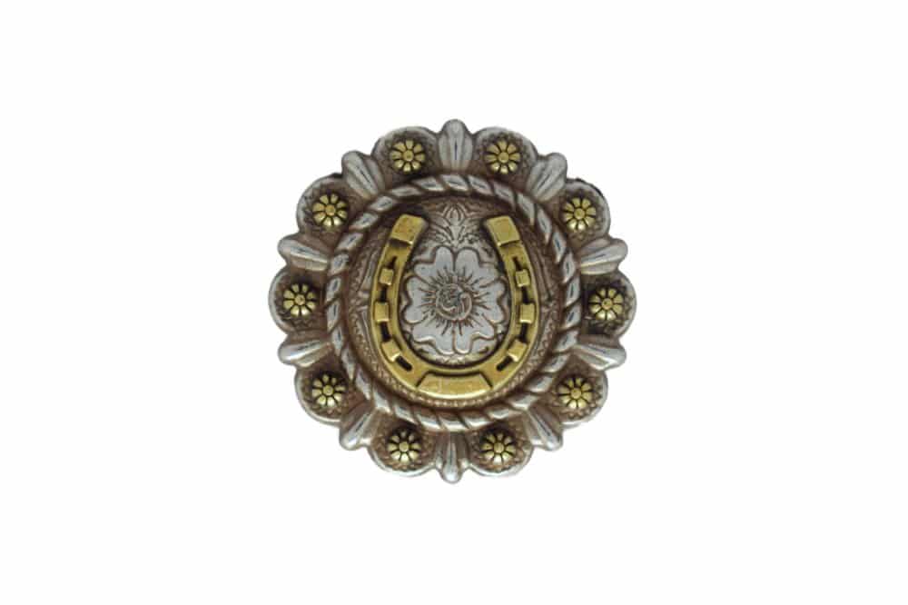 Round, silver concho with horseshoe design and berry/rope border. 1 1/4″ diameter. Screw back attachment. Made of nickel