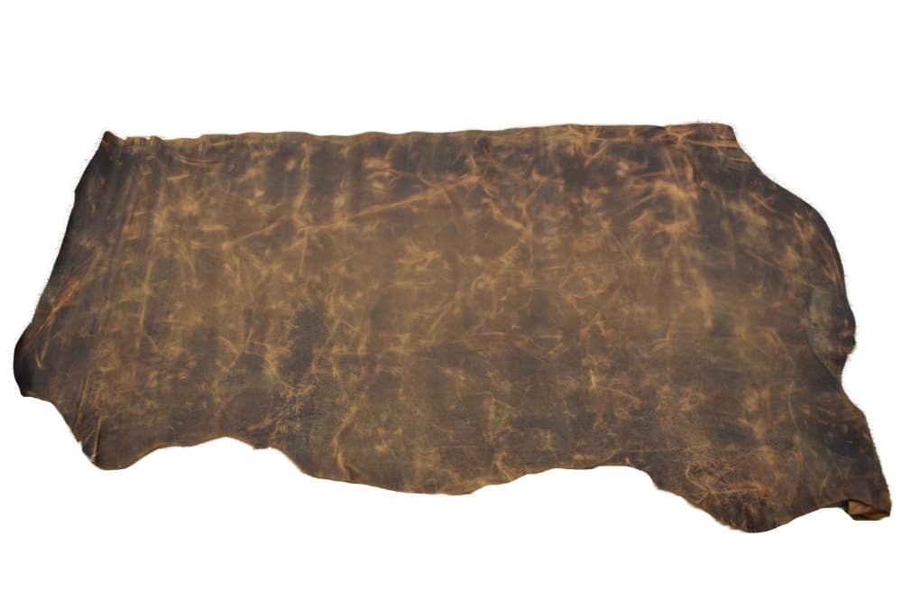 Our Big Sky bison leather in a light brown color with dark undertones. With a waxy composition, this leather has a wonderful pull-up effect. As you pull and use the leather, the darker tones give way to the lighter tones. At 4-6 ounces thick (1/16″-3/32″), this leather is ideal for bags, wallets, totes, bookbinding, and more.