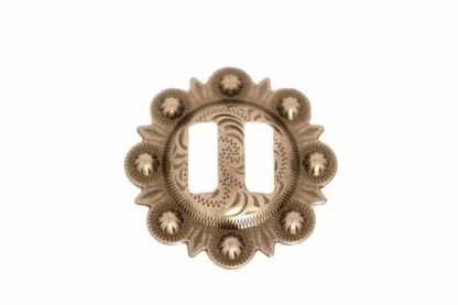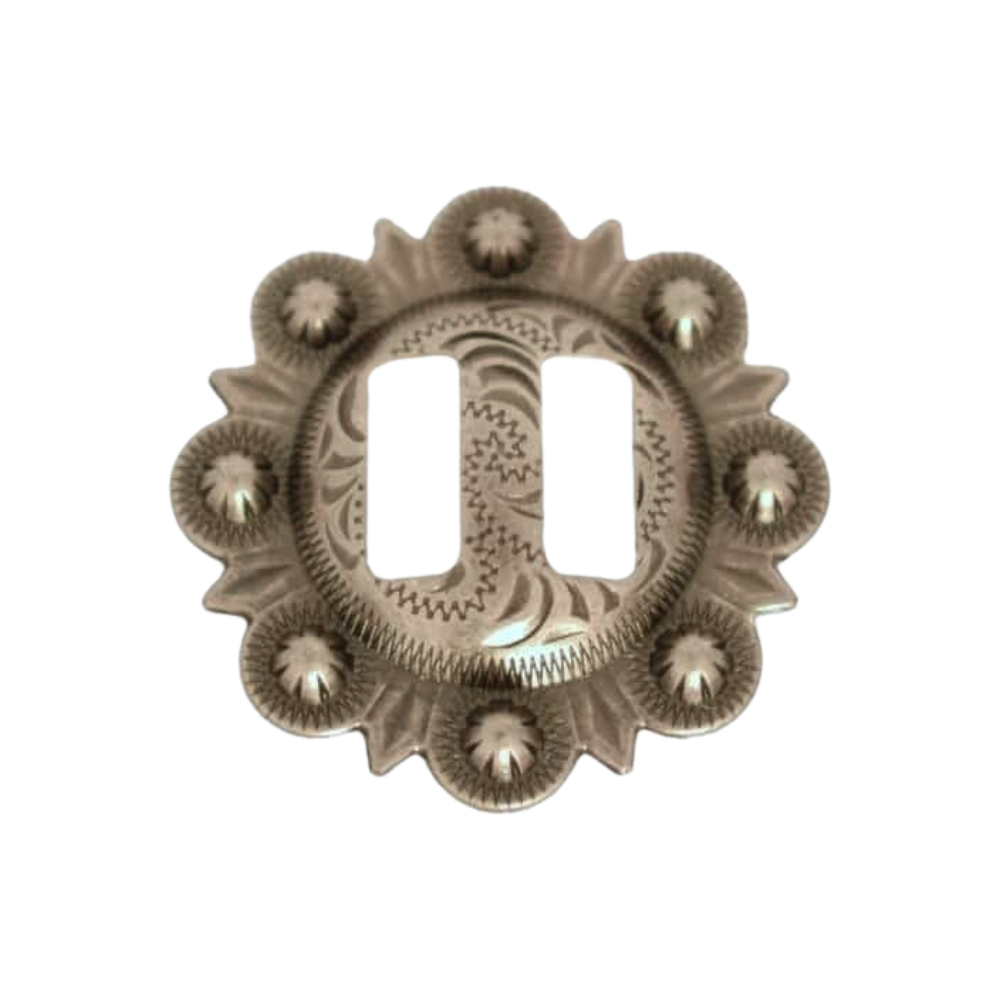 An engraved antique silver concho with decorative berries and slots for lace. Available in three sizes: 1″, 1 1/4″ & 1 1/2″.