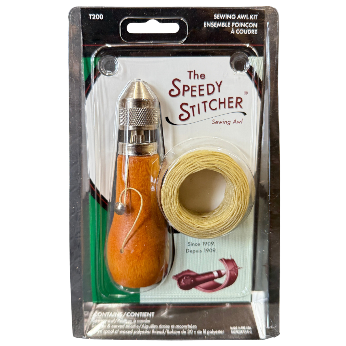 The 200 Speedy Stitcher is one of our most popular products. Sewing is made easy with this product. Includes a sewing awl, straight needle, curved needle, and a 30 yards roll of waxed polyester thread. Excellent for use on leather, fabrics, outdoor and camping equipment, saddlery, upholstery and more. Includes easy to follow instructions.