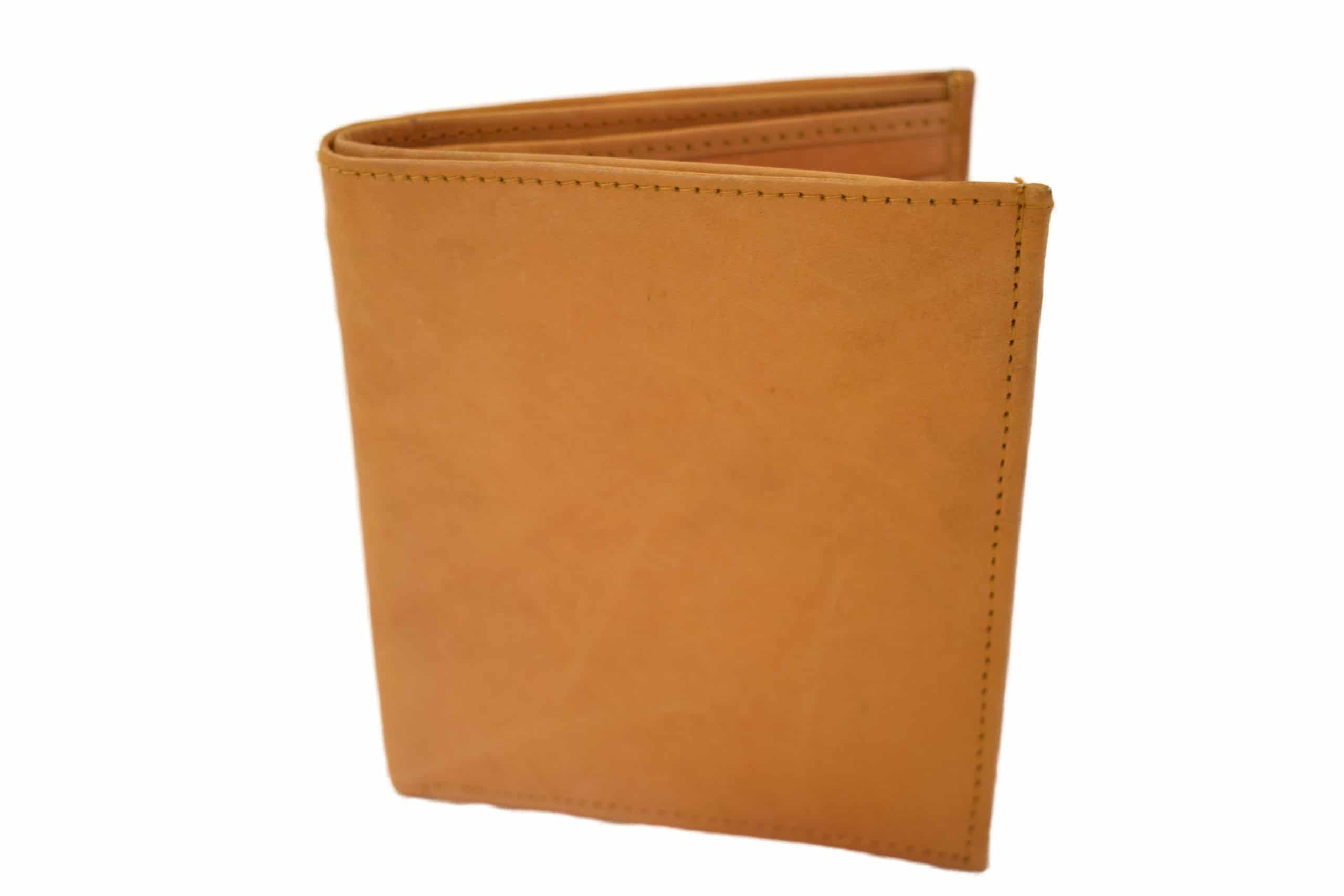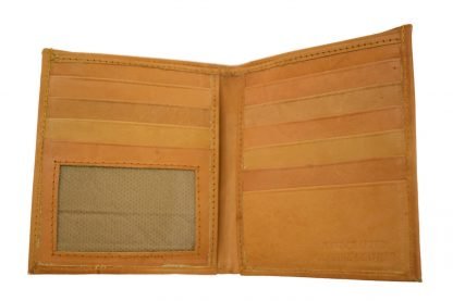 The tan leather hipster wallet provides tons of style with its enlarged design. Measures 4.5? x 4? x 1? in total size. Made with 100% genuine cowhide leather. Includes two large pockets for cash, as well as a large zipper pocket. Plenty of slots for credit cards too.