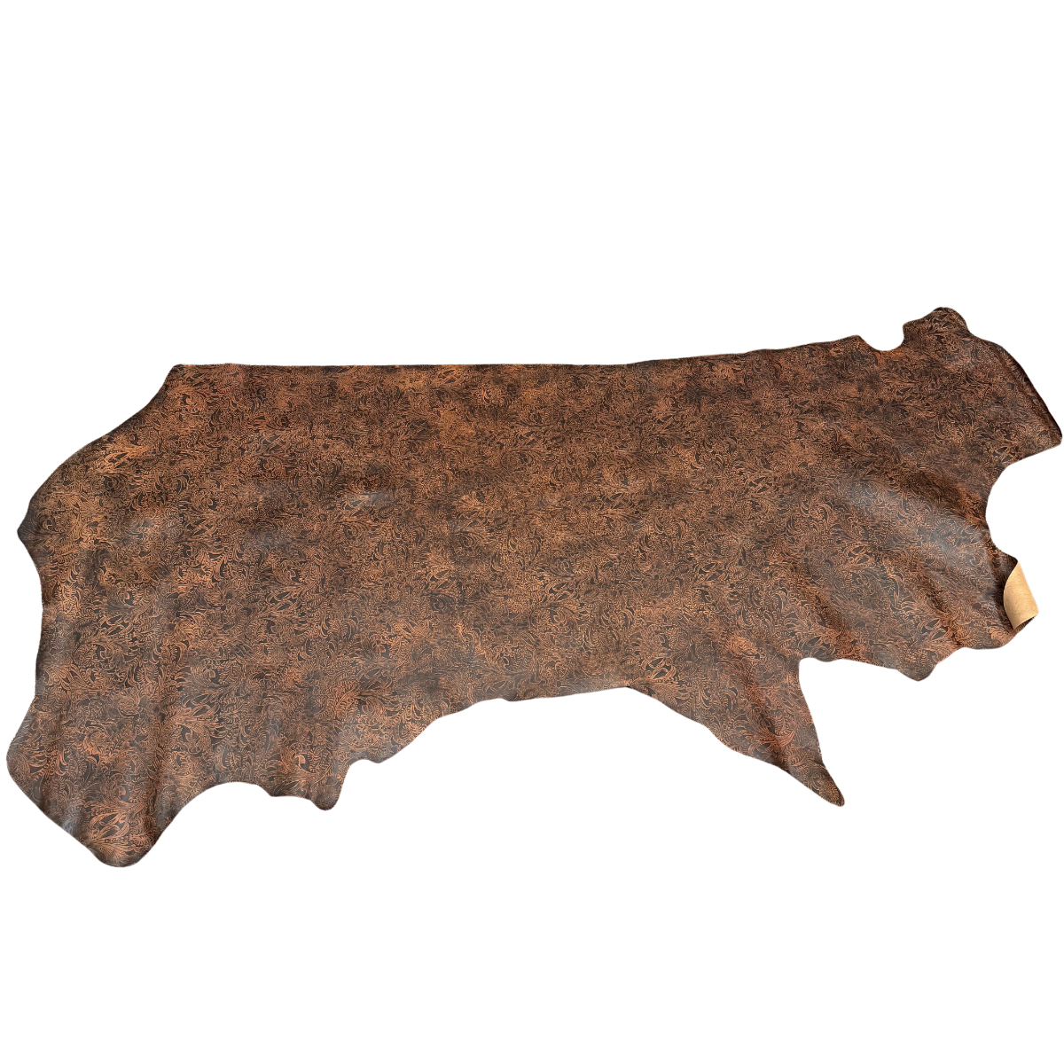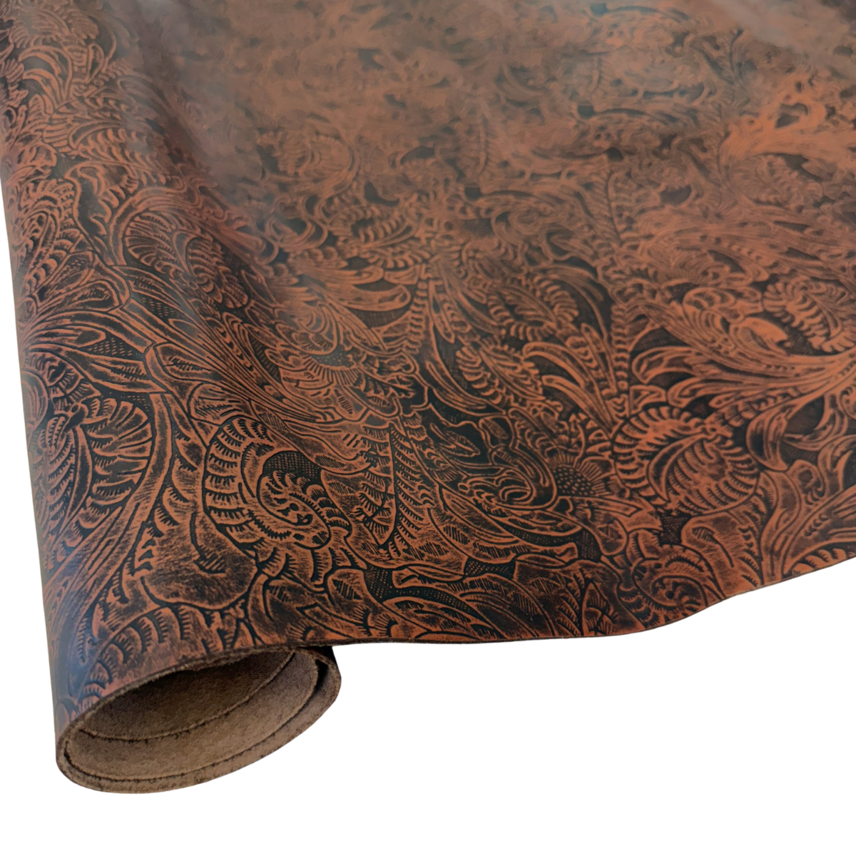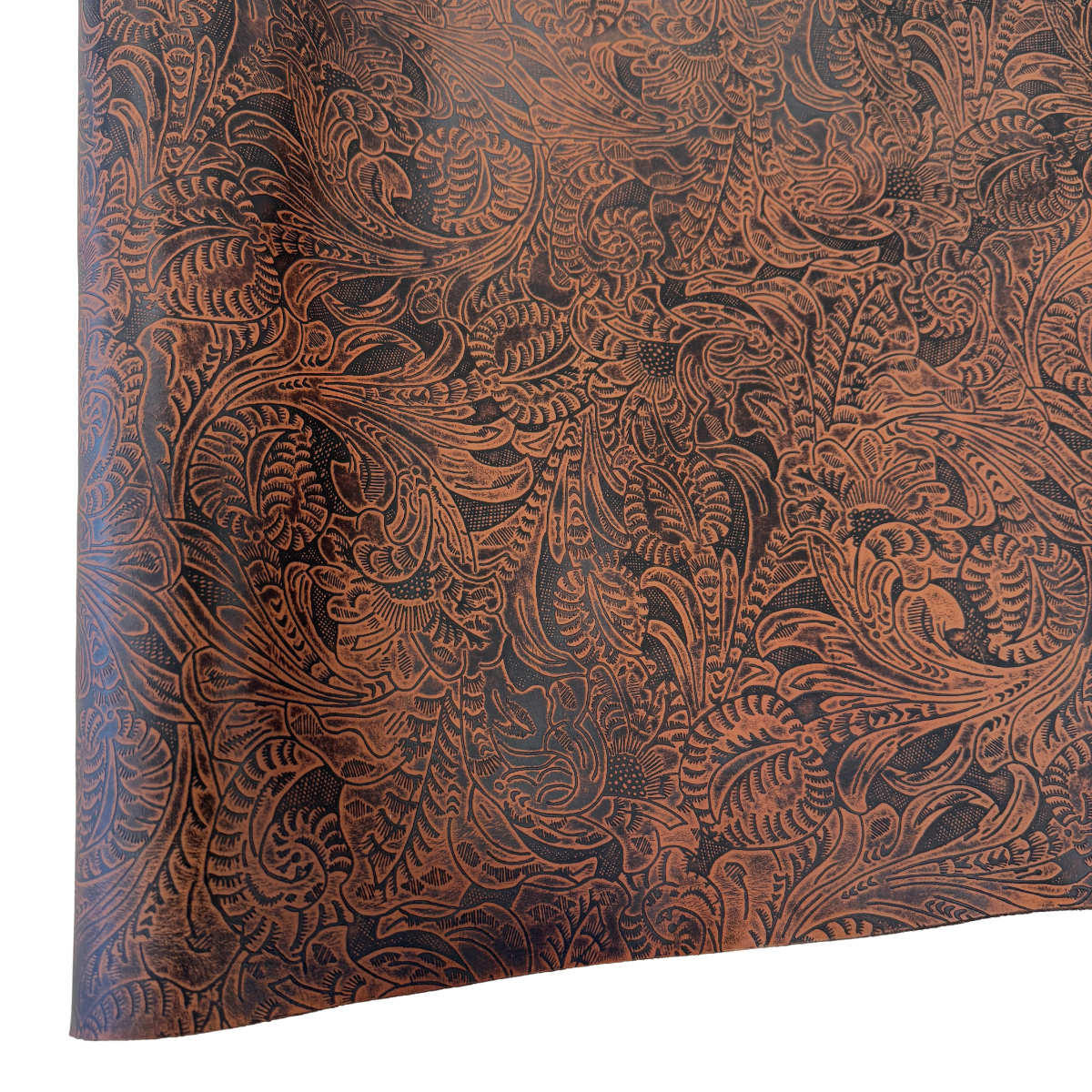 Western Floral embossed leather in a medium brown color. At 3-4 ounces (1/16″) and mild to medium stiffness, this leather may be used for making bags, wallets, earrings and more. Some of the undertones in the tan variation run from light brown to dark brown to black, occupying an earth tone spectrum. Cut pieces are available too!