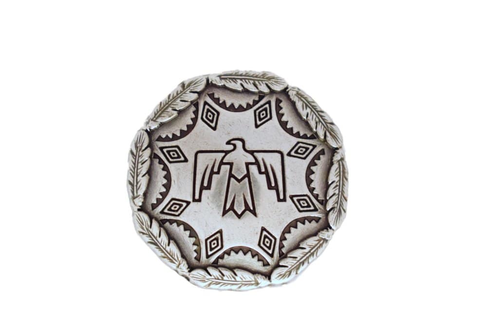Round, silver colored concho with a thunderbird engraved design and feather pattern border. Screw back attachment. Made of nickel.
