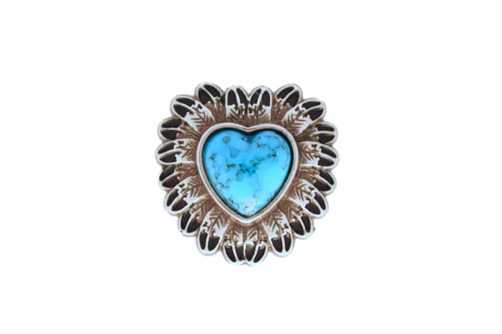 Heart shaped concho with a turquoise set in the center. Screw back attachment. Bordered by silver colored feather pattern. 1″ wide. Made of turquoise and nickel.