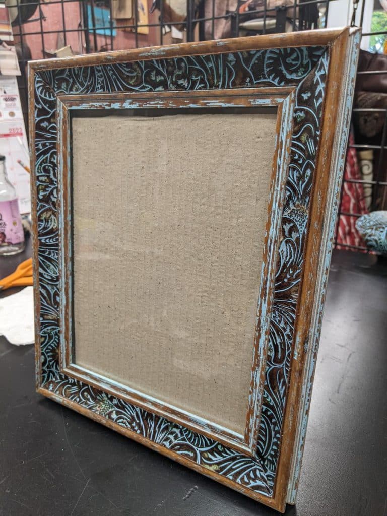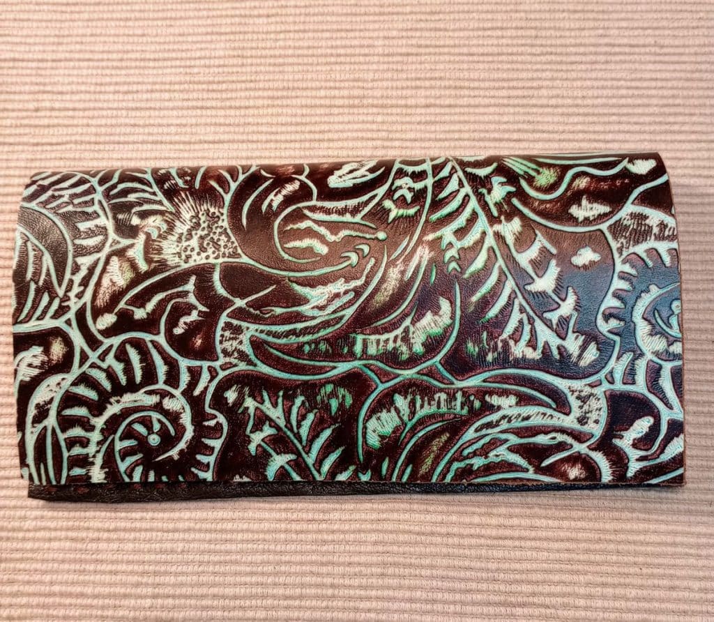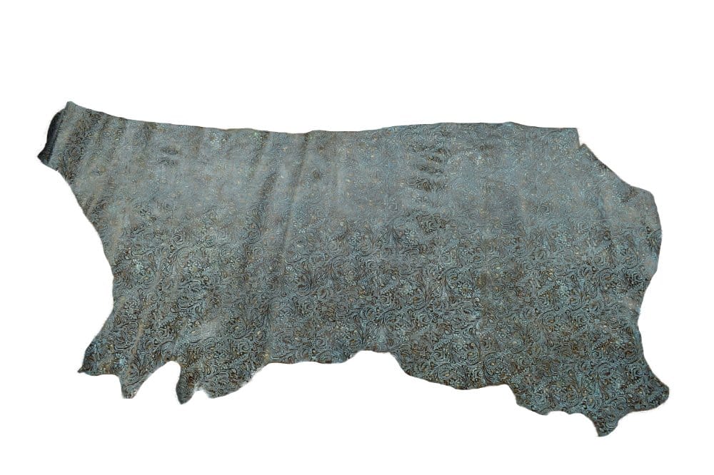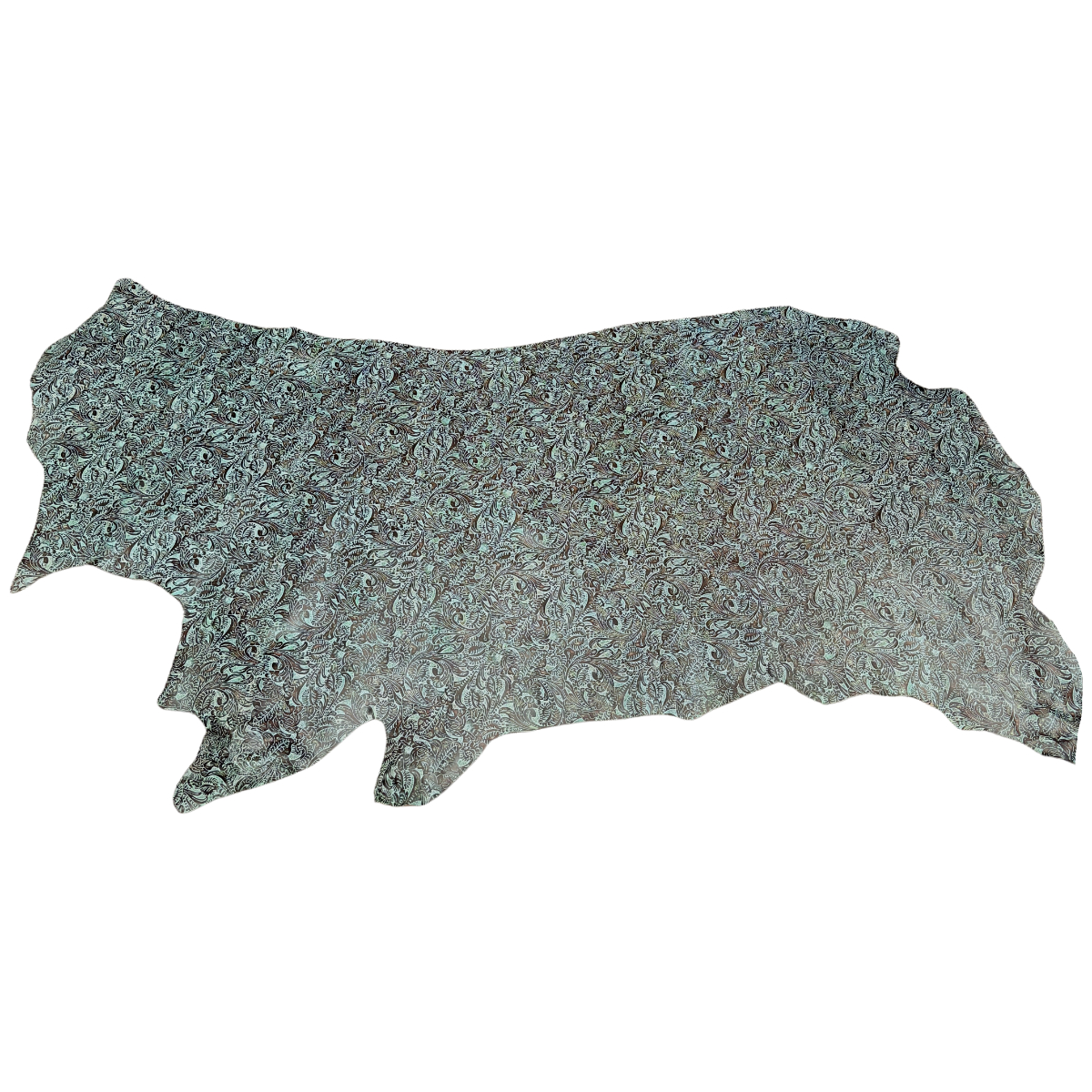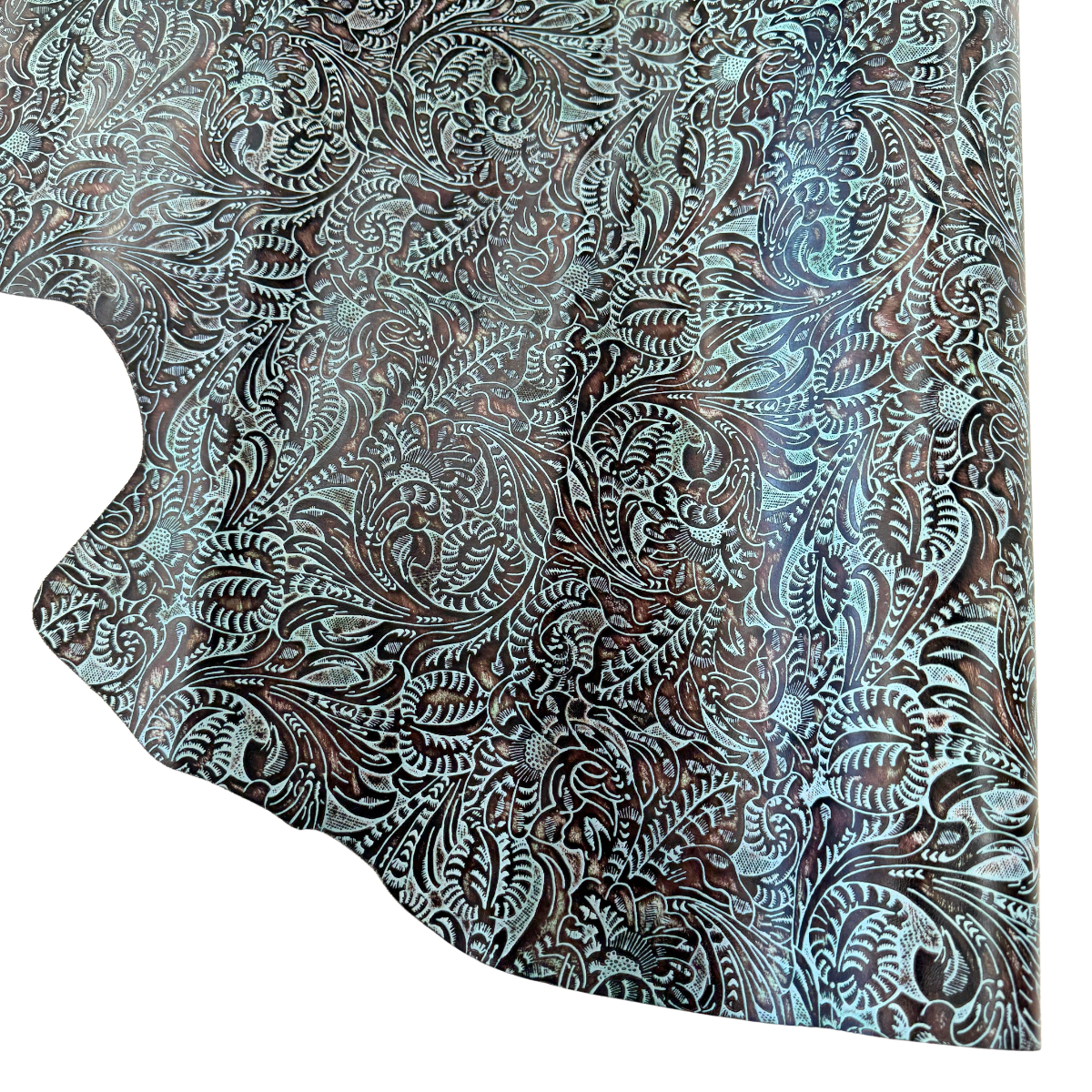 Western Floral embossed leather in turquoise. At 3-4 ounces (1/16″) and mild to medium stiffness, this leather may be used for making bags, wallets, earrings and more. The turquoise in this leather has brown undertones, giving it a distinct look. Cut pieces are available too!